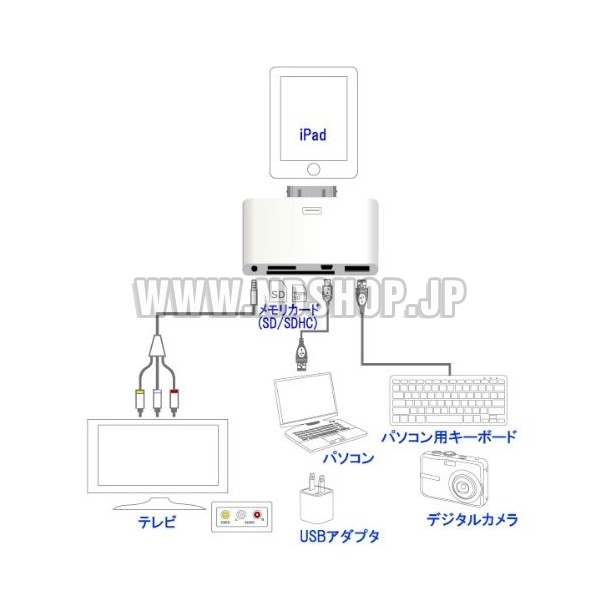 iPad内の映像や画像をテレビに大きく映したり、デジカメのSDカードに入っている画像をiPadで見たり、iPadにキーボードをつないだりできます